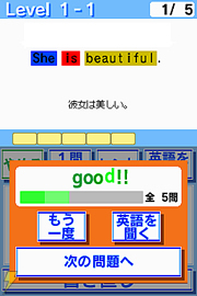 『えいご漬け』は、DS本体から聞こえる英語を聞き取り、タッチペンで画面に書いていくシンプルな英語トレーニングソフト。毎日繰り返してプレイすることで、自然としっかりとした英語の基礎が身についていく。