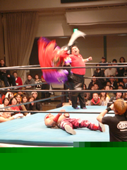 気になる試合は、開始直後に孤立した義経選手が、ガルーダ&ラッセ組の連携攻撃を受けるという苦しい展開でスタート。しかしながら、集中砲火をかいくぐり次々と華麗な空中技を繰り出す義経選手に、ファンの声援が集中。「義経ー!!」という今回初めてみちのくプロレスのリングに響く声援を受け、見事に3カウントを決めて義経&新崎人生組が勝利を掴んだ。