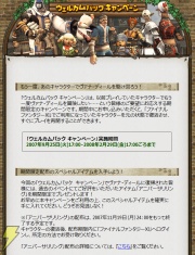「ウェルカムバック キャンペーン」は、完全にキャラクターデータを削除した場合であっても、これまで育ててきたキャラクターを元の状態で復活させて、すぐにプレイを再開できるというもの。通常の復活手続きや、スクウェア・エニックスのインフォメーションセンターでの復活手続きが行えない人を対象にしたキャンペーンとなっている。キャンペーン期間は2008年2月29日17:00まで。詳しい内容は、