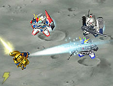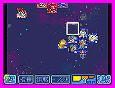 | 小隊編成&戦闘画面。先頭に立つ機体は、敵に狙われやすくなるのだろうか……? | |