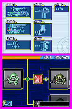 | 本作で初登場となる新システム「小隊システム」。タッチペンを使えば、スムーズに小隊を編成することが可能だ。 | こちらが本作のマップ画面。画面右下のスライダーを変更することで、3段階に縮尺を切り換えられる。 |