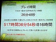 そして、この懇親会では「クローズドベータファイナル」の結果報告が行われた。発表されたのは、使用された武器種別のランキング、猟団の人数、所持ゼニー、プレイ時間などのデータ。このなかで会場がもっともどよめいたのは、最多プレイ時間についての発表。テスター全体の1日平均プレイ時間が26分48秒だったのに対して、もっとも長くプレイしていたテスターの1日平均プレイ時間はなんと15時間以上! ちなみに、クローズドベータファイナルが開催されていた時間は816時間で、このテスターは合計517時間36分54秒プレイしていたとか。