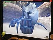 ここで、杉浦氏から「撮影禁止の本日限定プレゼント」として披露されたのは、『MHF』第2のオリジナルモンスター! 見た目は“ガノトトス”に近く、「魚竜種」であるという。全身はいかにも堅そうな、金属質の光沢を放つ外皮に覆われていた。印象としては、“ガノトトス”に“グラビモス”の鱗をまとわせた感じ。また、1点だけ公開されたスクリーンショットでは、火山を舞台にハンターと戦闘を繰り広げていた。