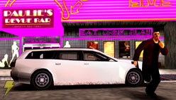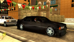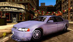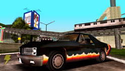 | 車高の低いシルバーのファミリー型セダン。スピードとパワーを兼ね揃えており、障害物に突入してもボディーは最小限のダメージしか受けない作りになっている。スピンしやすいため、サイドブレーキをうまく使えないと運転に苦労するだろう。「ポートランド」をシマにしている「シンダコ・ファミリー」が愛用している車で、彼らの本拠地である「ドールズハウス」付近に停車してある。 | 最近「リバティーシティ」にやってきた、ヒスパニック系ギャング「ディアブロ」たちの車。パワフルなアメリカ車を改造したこの車は、黒く塗装したあとにファイヤーパターンのビニールステッカーが施されている。改造されているのは外側だけでなく、エンジンも最高の状態にチューンされている。ヘップバーン・ハイツ付近でよく見かけるこの車は、走りながら敵を銃撃するのにもってこいだ。 |
