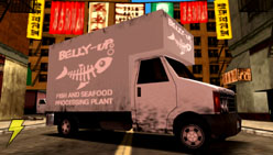 | 「セント・マークス」付近で、オペラを大音量で流しながら走っている黒いセダン。ターボエンジンにより加速力を強化し、車高を低くしてタイヤを幅広のものに変えることでグリップを改善してあるので、逃げ足が必要なときにはもってこいの車といえるであろう。ちなみに「Leone Sentinel」の停車位置は“ドン・サルバトーレ”の邸宅前。ボスのものを盗む勇気があるなら覚えておこう。 | 大きな車体は小回りが利かないが、かなり多くの魚を積むことができる。魚を積んでいる利点は、警官たちに荷物の中を厳しくチェックされないこと。万が一荷物を突きまわされても、何日も残る魚の臭いにこりごりして検問係もしばらくは寄り付かないだろう。そのため「Triad Fish Truck」は爆発物を大量に詰め込むのに適している。Triad Fish Truckはポートランドの中華街で多く見られる。 |