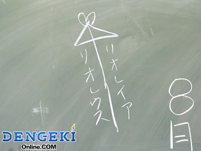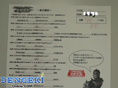 そしていよいよ授業開始。と思いきや、いきなり担任の先生から「モンハン模試」が配布されました。裏返しで配られるところが、テストっぽくて嫌ですね(笑)。問題は『モンスターハンター』に関連した20問。制限時間は5分と短かったのですが、なんとか終わりましたよ。ちなみに最初の問題は、「記念すべき1作目『モンスターハンター』の発売日はいつでしょうか?」というものですが……知りません(泣)。どうやらこの問題の正解率は軒並み低かったようで、ちゃんと予習しておくと次回のテストで助かるかもしれません(あるのか?)。