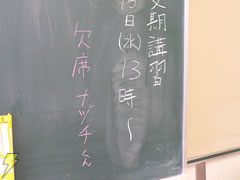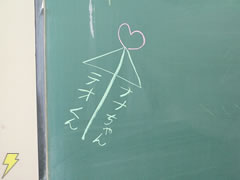 黒板にはこんな書き込みが! 仲いいんですね。この欠席している「ナヅチくん」というのは、“オオナズチ”のこと? |