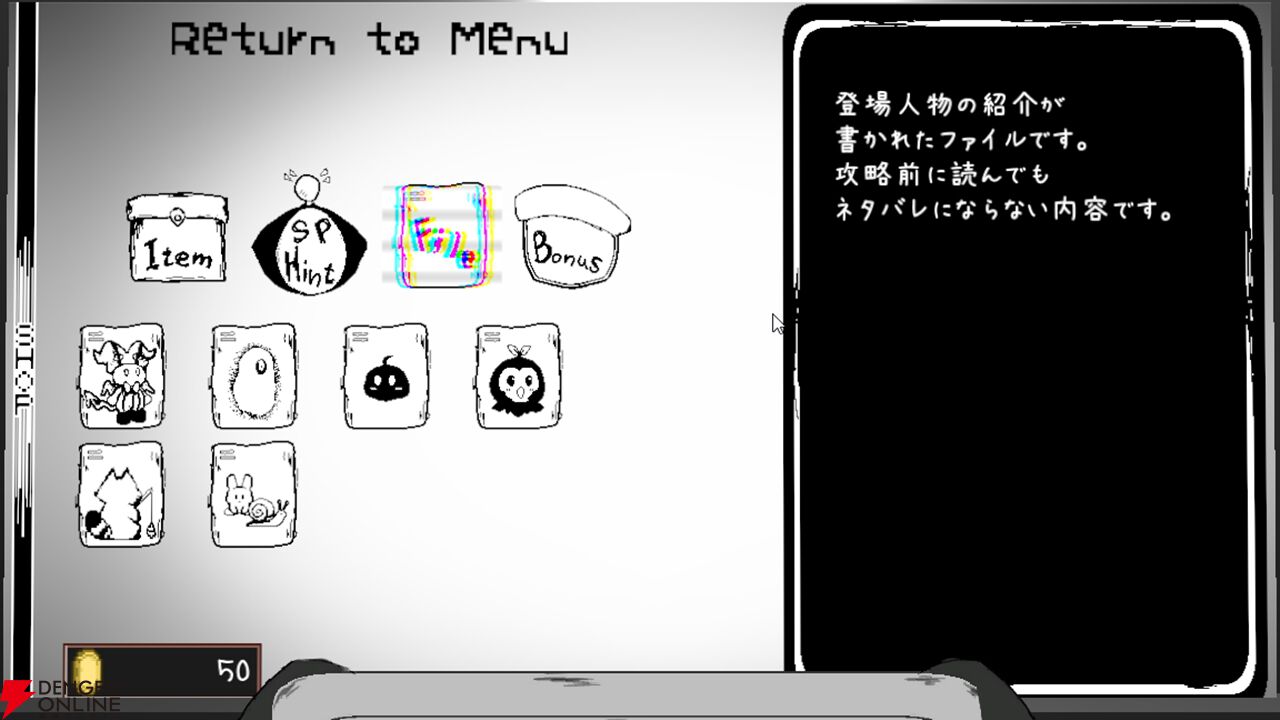 サブ的な目的として「ゲームオーバー」のコレクションが存在し、これは単なるやられ集ではなく、各ゲームオーバーに対応するスチルとテキスト用意された、一つのエンディングに近いものとして位置づけられるようです。