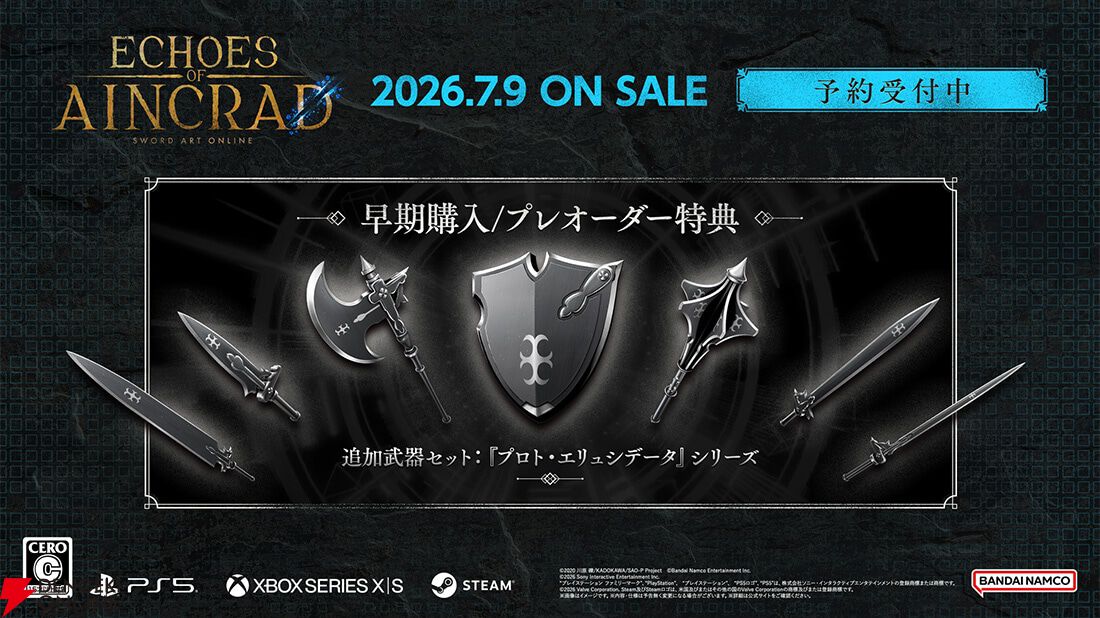 バンダイナムコエンターテインメントより、7月9日発売予定のPS5/Xbox Series X|S/PC(Steam)用ソフト『Echoes of Aincrad』について、主な購入特典をまとめました。