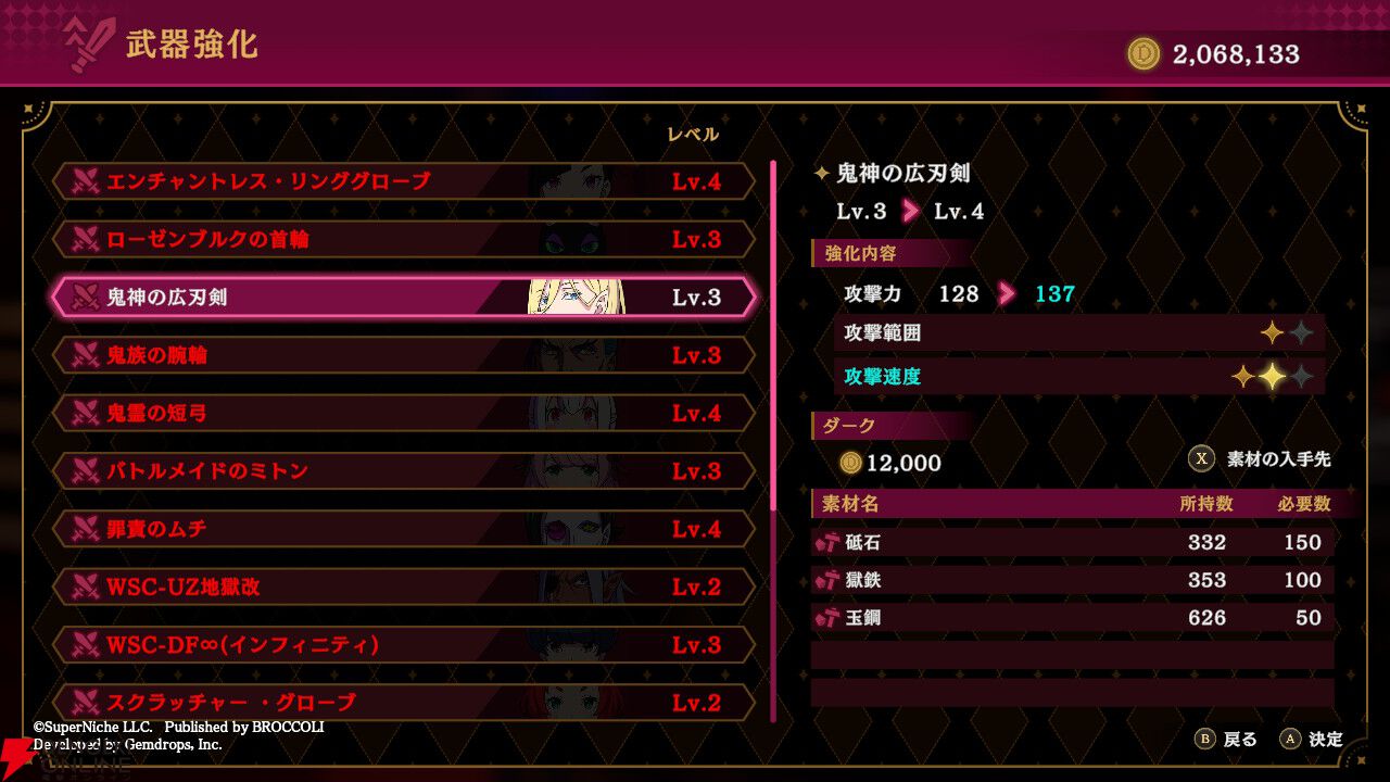 武器強化用とは必要素材が異なり、なかなか集めにくいのですが、1項目でも強化できればバトルがラクに。バトルで苦戦するなら、こちらの強化に着手するといいでしょう。