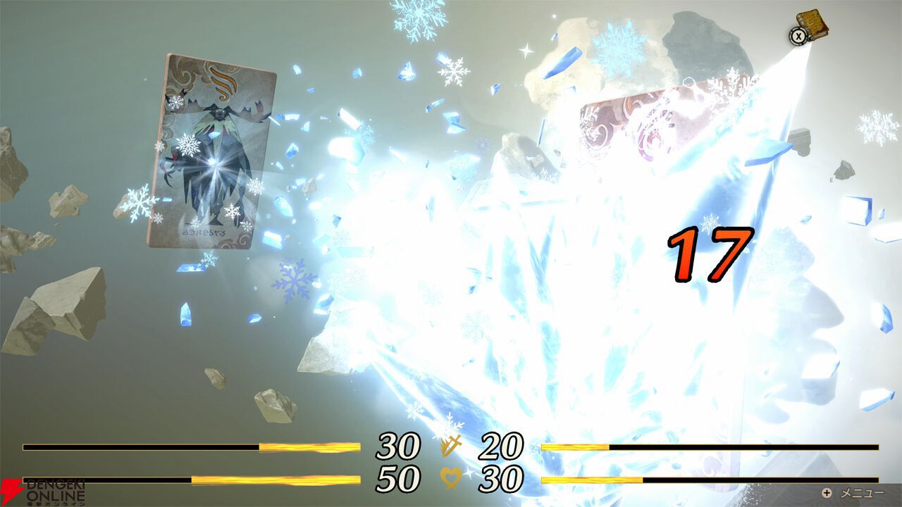 ゲームの要素としての扱いは従来と同じですが、カーソルを動かしたときに紙ではなく石がこすれ合うような音が出たり、戦闘でも破れたり燃えたりするのではなく、カードが砕け散るような演出に変わっています。