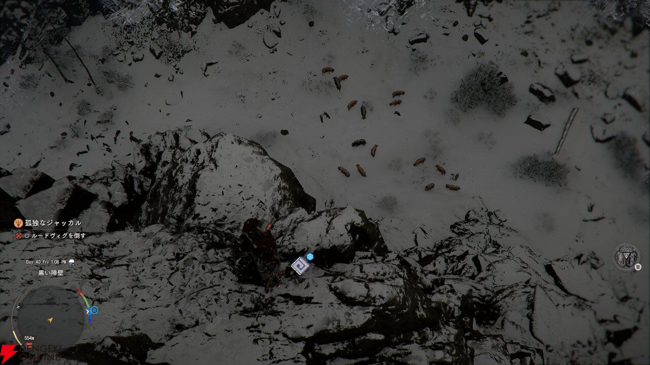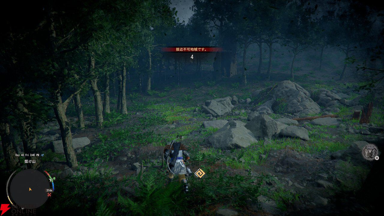 “接近不可地域です”という無慈悲な表示が! まあストーリー上訪れてはいけない場所に行こうとするとこの手の表示が出るのも、オープンワールドゲームあるあるですよね。構わずもう少し進んでみます。