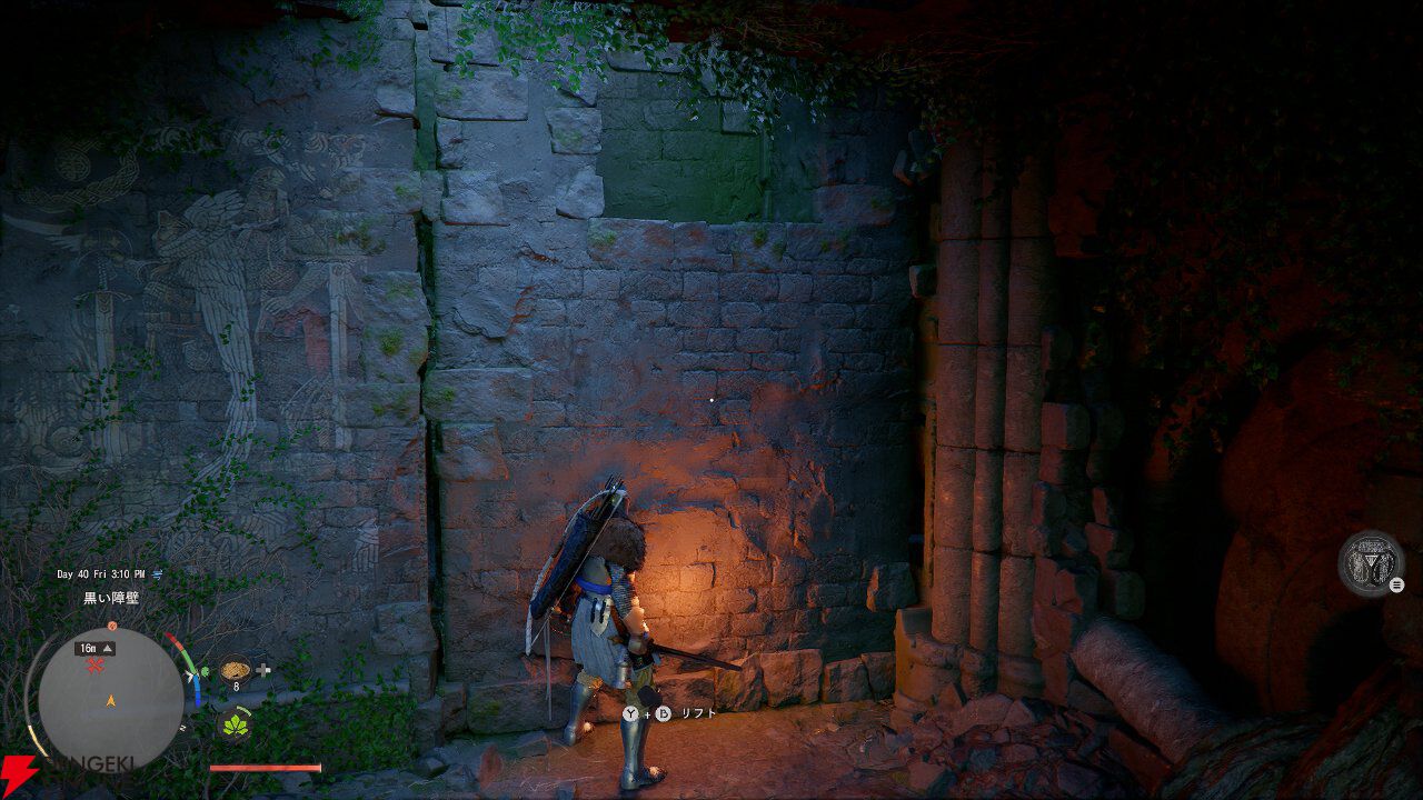 壁を越えて地面に降りると、遺跡を発見。リフトでギミックを動かしてみると……。