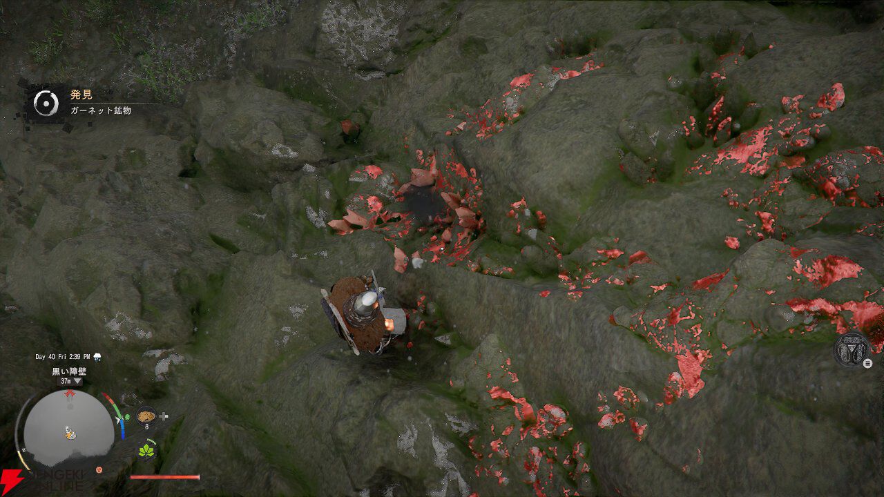 最初に発見できたのは、岩壁にあったガーネット鉱物! この時点ではかなりの貴重品です。すぐに必要な装備はないですが、ひとまず場所だけ覚えておこう……。