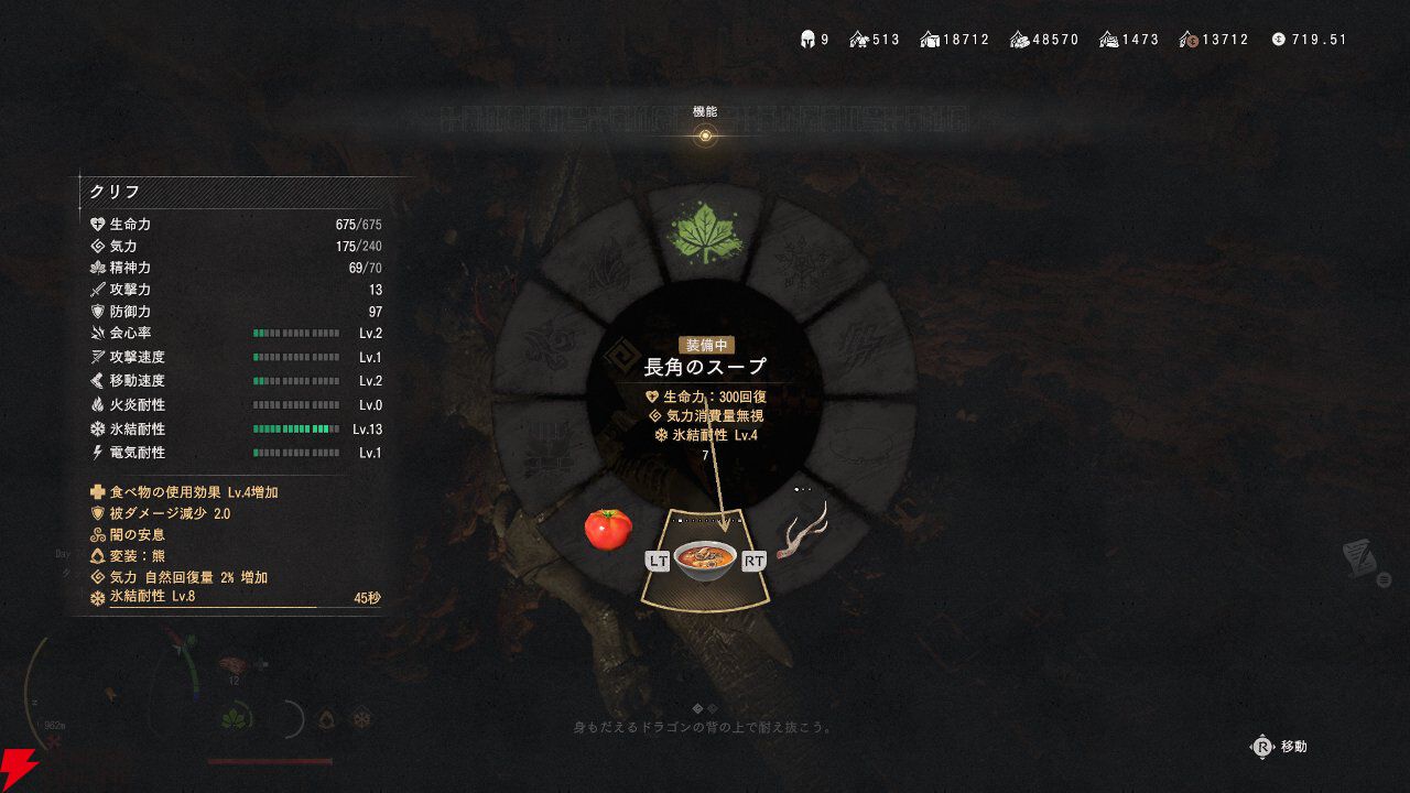 筆者の場合は、気力消費を無視できる回復アイテム“長角のスープ”を飲んでなんとか気力を持たせました。意外と気力消費なしの効果時間が長いので、使い勝手がいいですね。拠点で簡単に購入できるのも便利なので、もう少し常用してみようかな……?