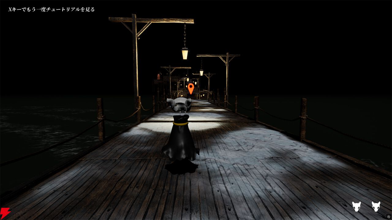 操作の基本を学ぶチュートリアルエリアは、薄暗い水上に浮かぶ一直線の桟橋のような場所です。ぼんやりと光る灯りがプレイヤーを導くように連なっており、進むべき道に迷うことはありません。
