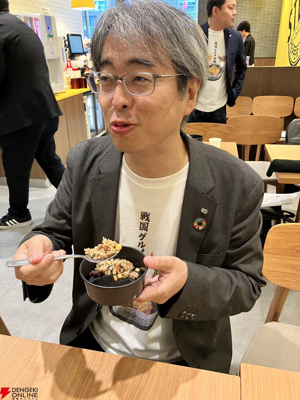 インタビュー後には、菊池氏もコラボメニューを実食。完成品は初めて食べるとのことで、その完成度の高さに驚きを隠せない様子でした。