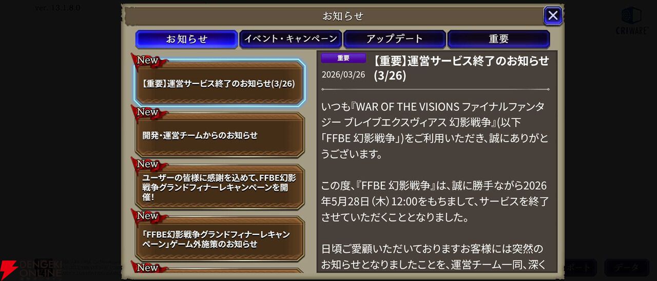 本日、お知らせで掲載をさせていただきましたとおり、『FFBE幻影戦争』は、誠に勝手ながら2026年5月28日(木)をもちましてサービスを終了させていただくこととなりました。