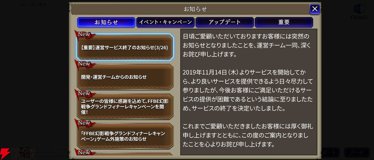 サービス終了の日まで『FFBE幻影戦争』をどうぞよろしくお願いいたします。