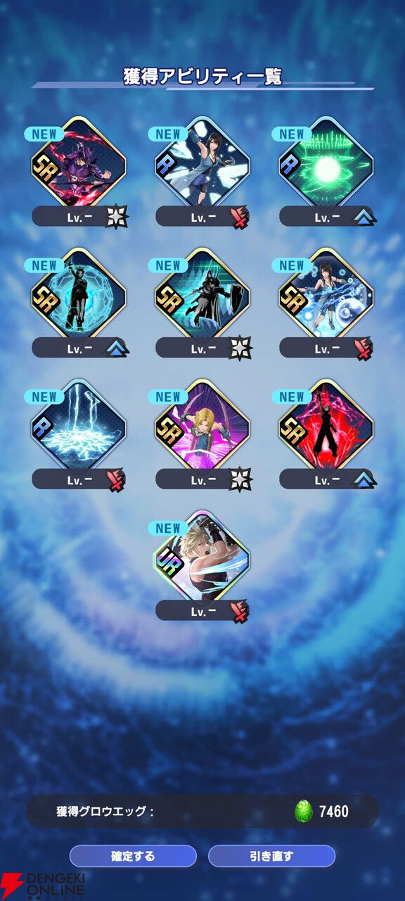 ガチャ演出時にクラウドが「俺はもう……迷わない」と力強く言うのですが、引き直すたびに言うものだから、かれこれ30回以上その台詞を言い続けているので、まるで説得力がないクラウドが爆誕。