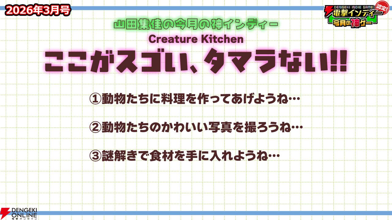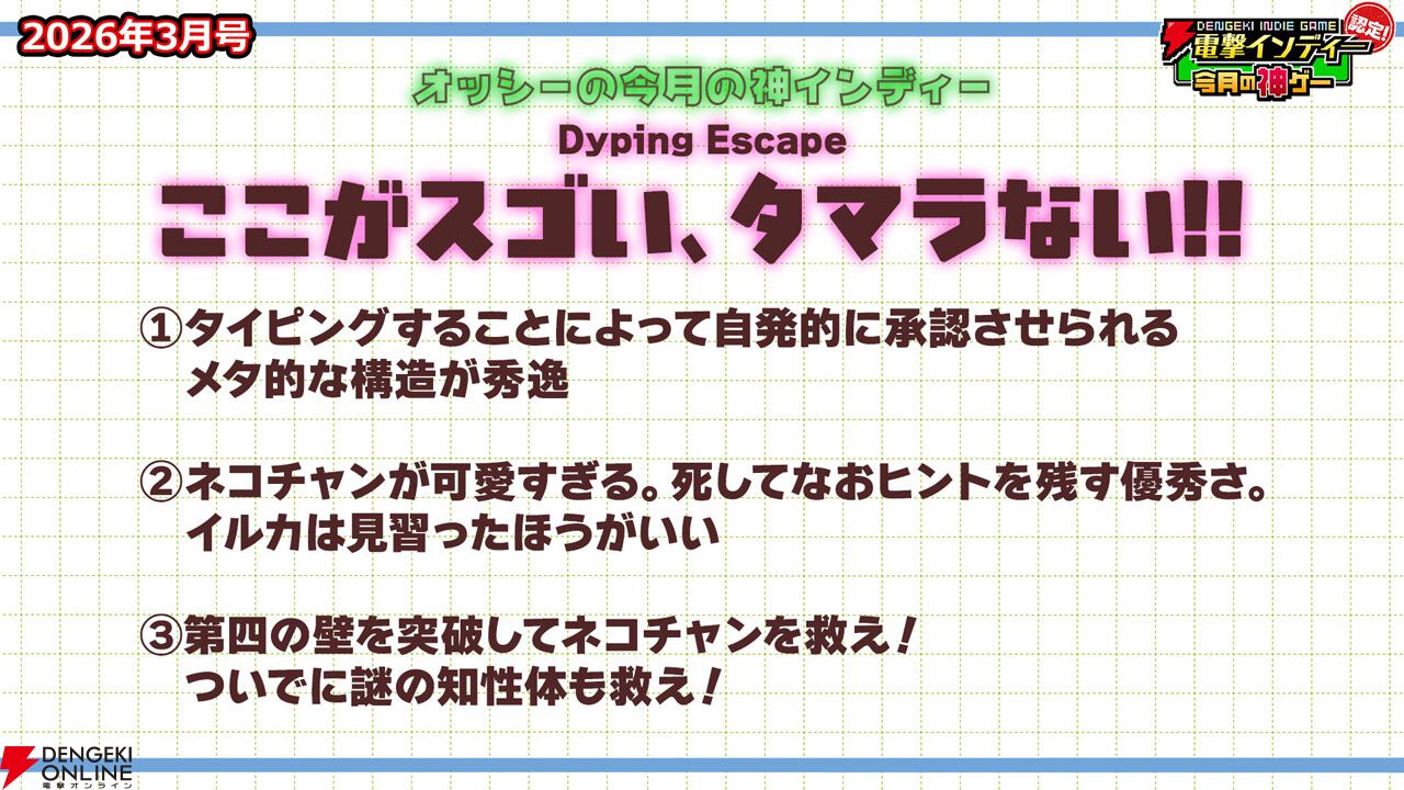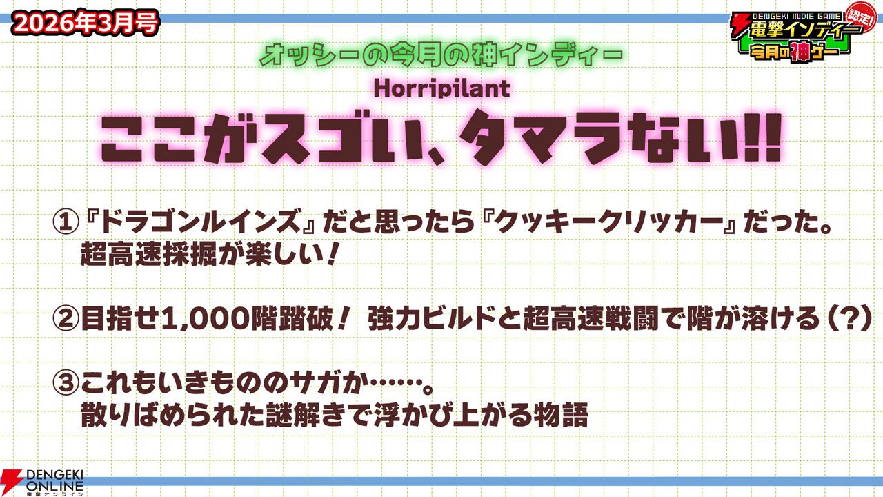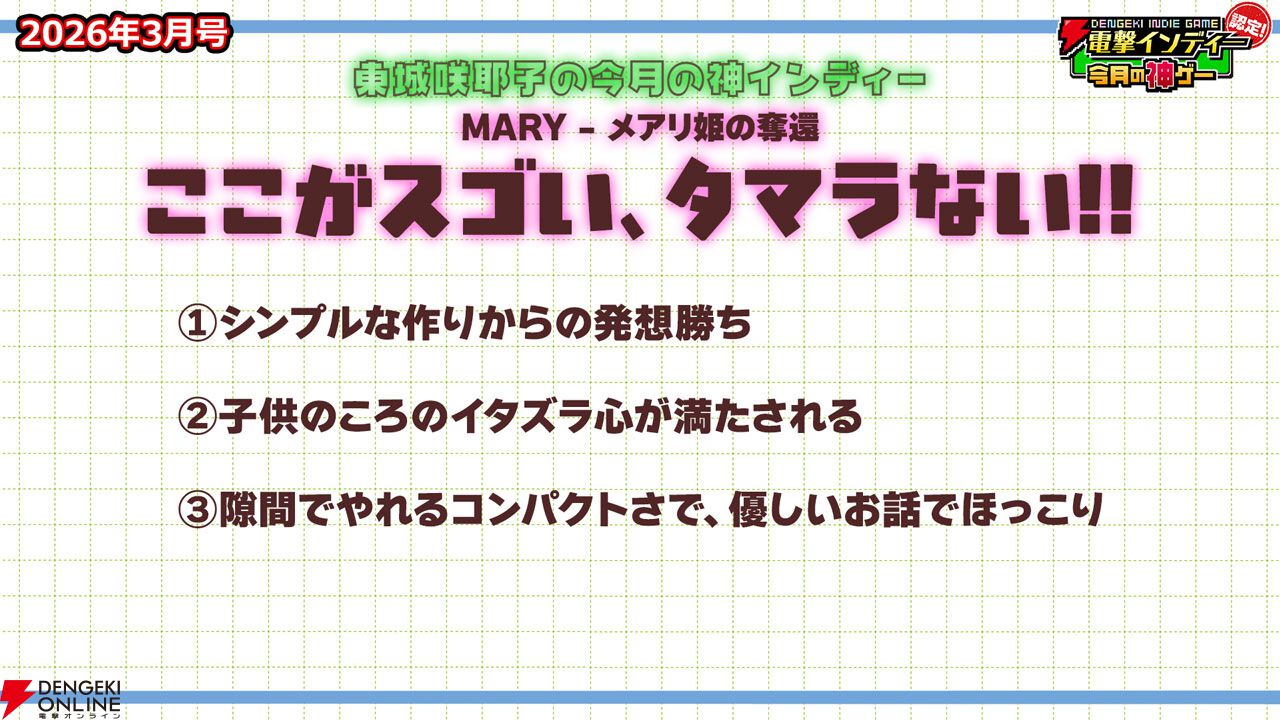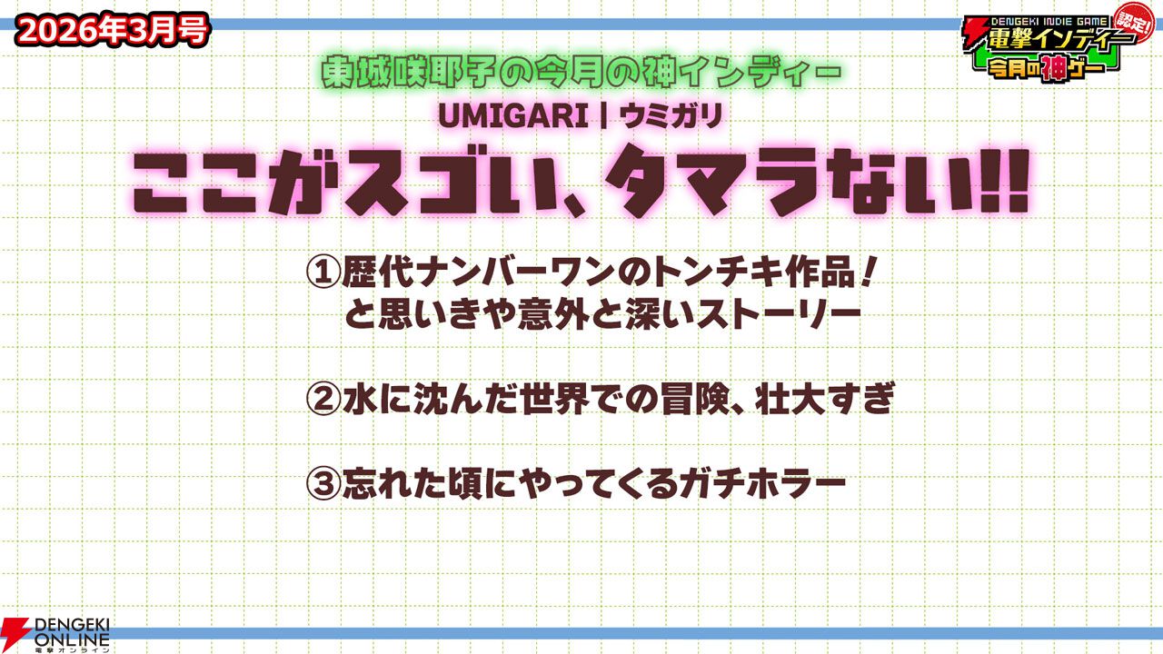 3月27日に配信された「電撃インディー認定!今月の神ゲー2026年3月号」において、2026年3月の“神インディーゲーム”が決まりました。
