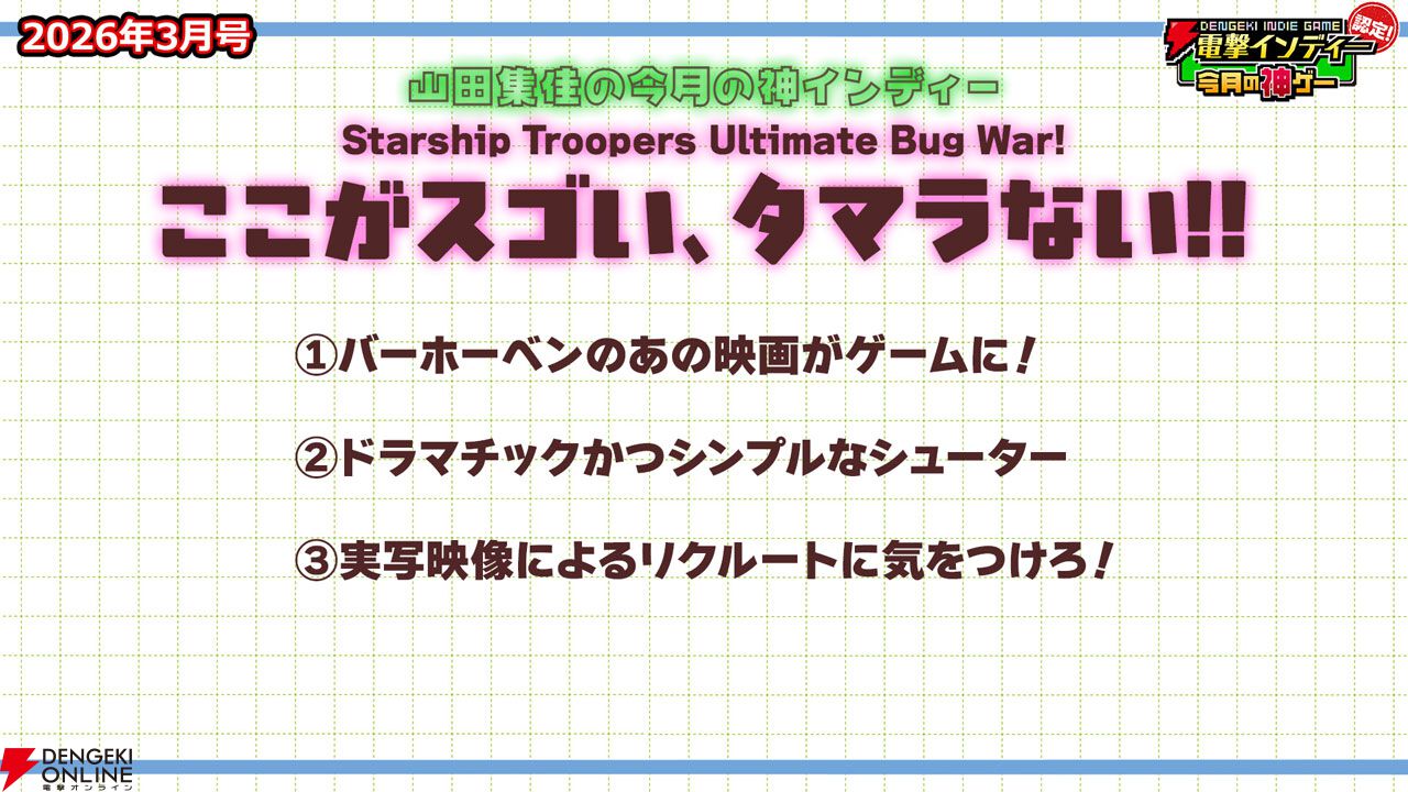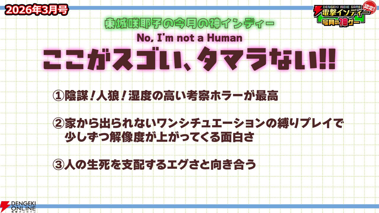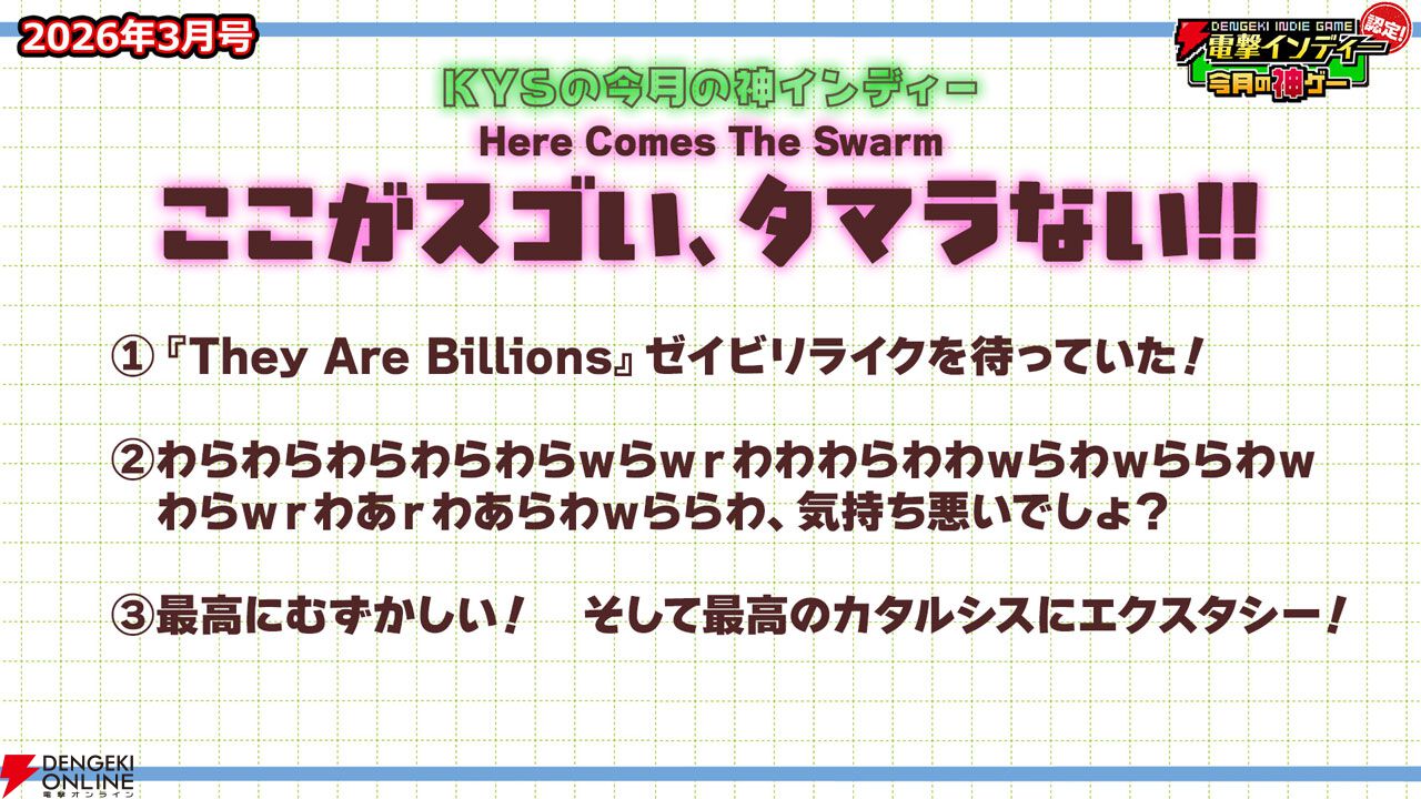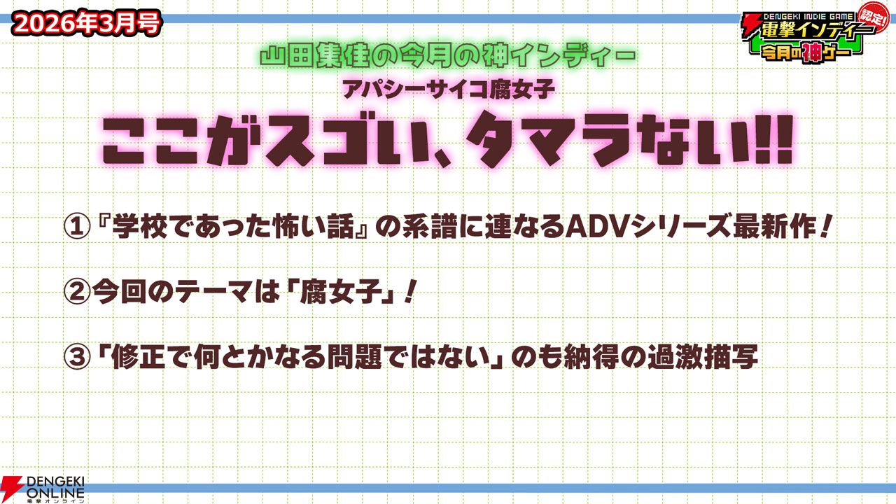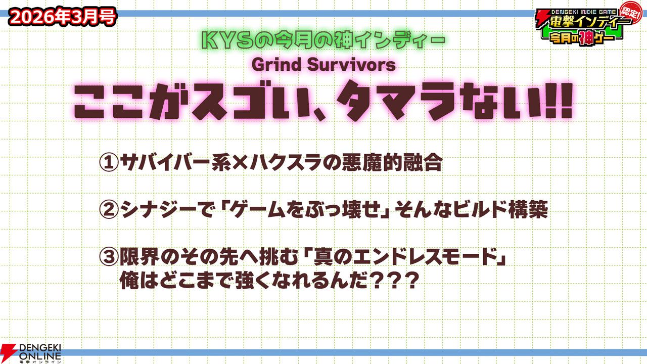 3月27日に配信された「電撃インディー認定!今月の神ゲー2026年3月号」において、2026年3月の“神インディーゲーム”が決まりました。