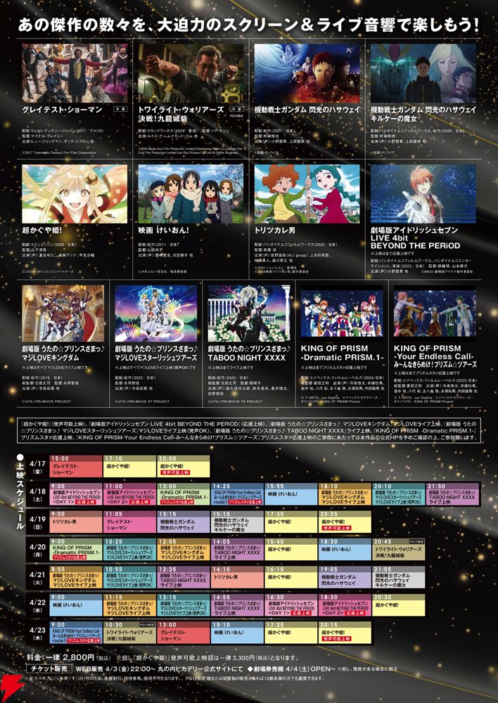 『機動戦士ガンダム 閃光のハサウェイ キルケーの魔女』や『映画 けいおん!』などが上映予定となり、さらに『超かぐや姫!』では発声可能上映回も用意されています。