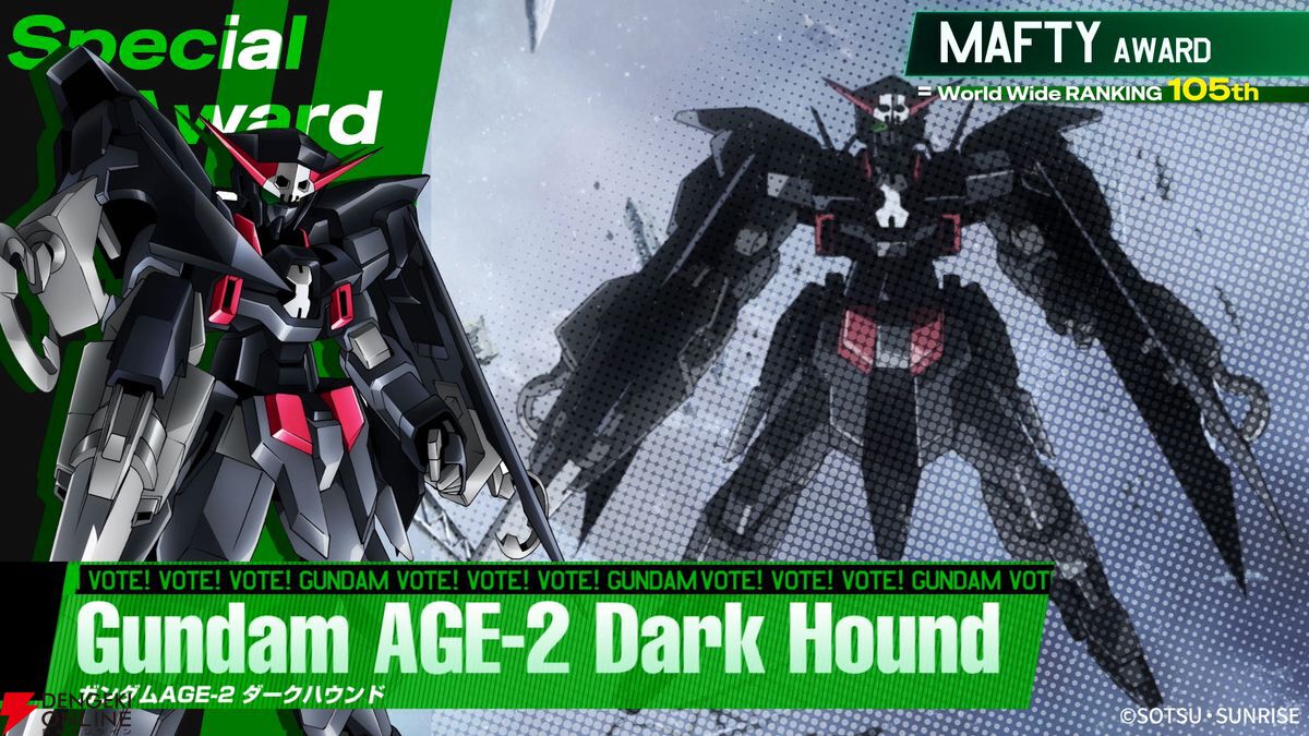 現在、全国の劇場で大ヒット公開中の映画『機動戦士ガンダム 閃光のハサウェイ キルケーの魔女』の舞台となっている宇宙世紀0105年にちなんで、全世界ランキング第105位に輝いたガンダムAGE-2 ダークハウンド(『機動戦士ガンダムAGE』より)には「マフティー賞」を。