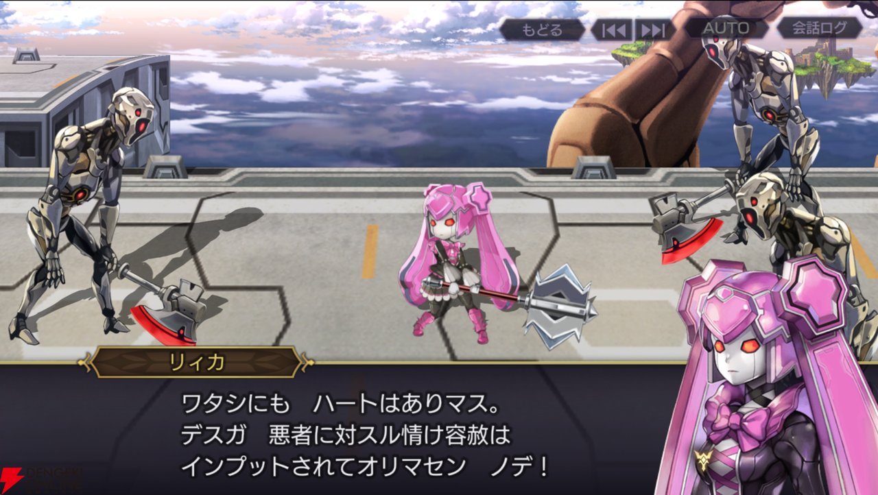 合成人間とは違う存在として登場する、アンドロイドのリィカ。初対面では合成人間に囲まれており、ちょうど戦闘になる直前でした。