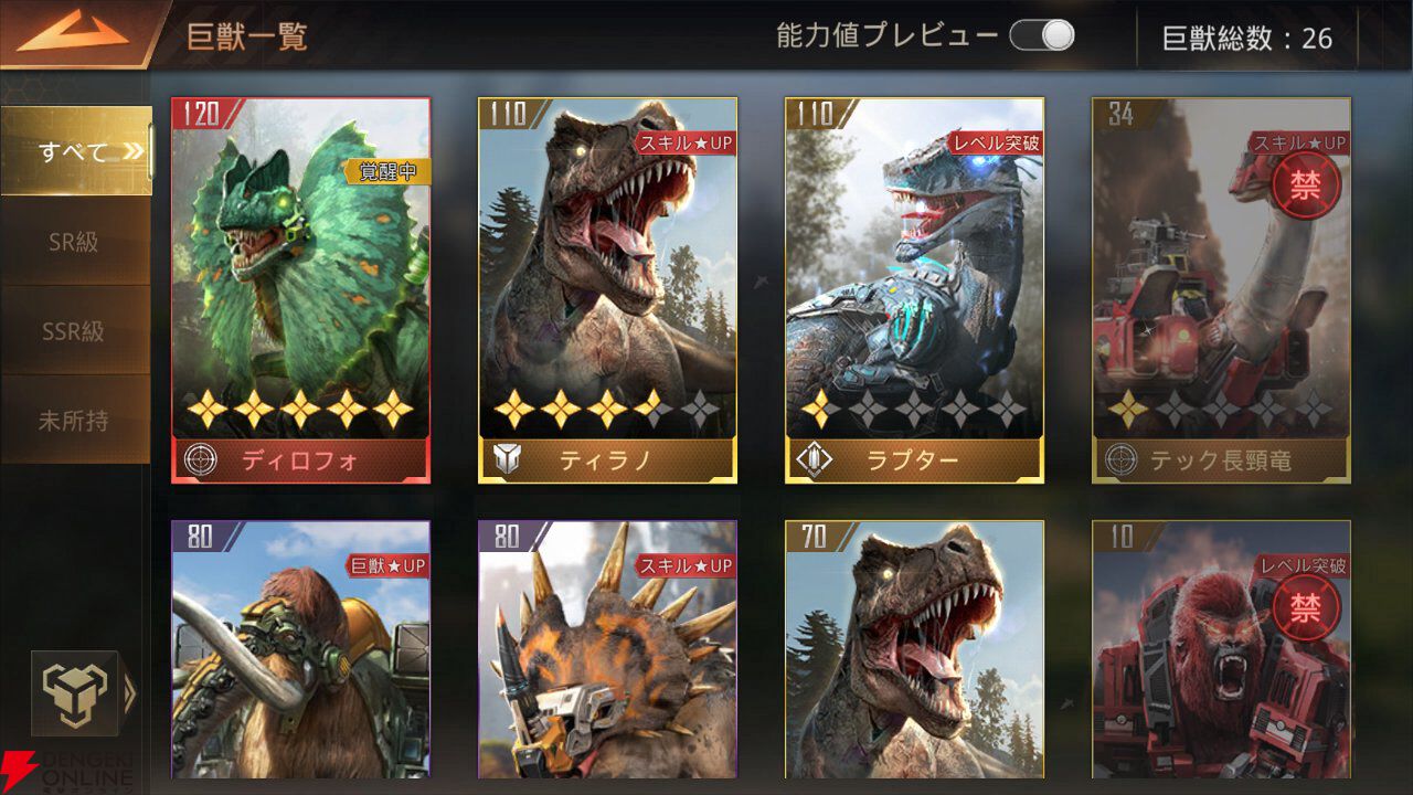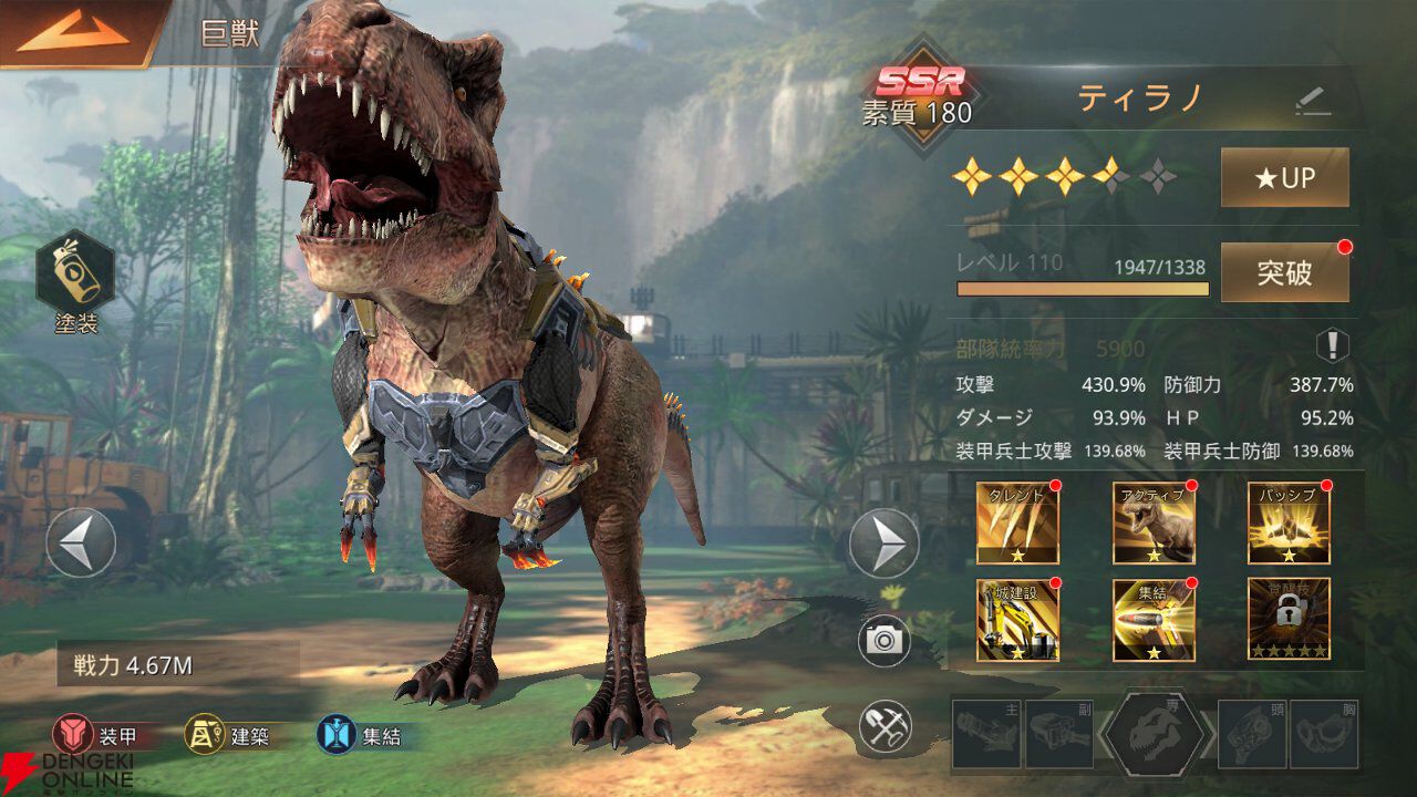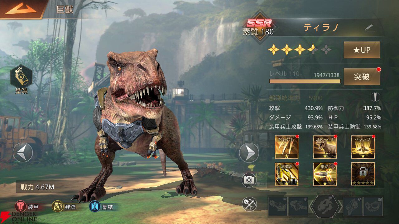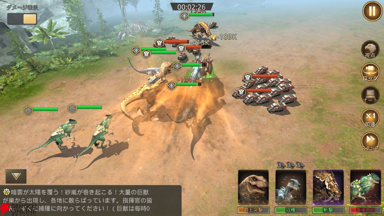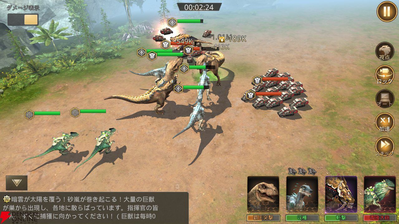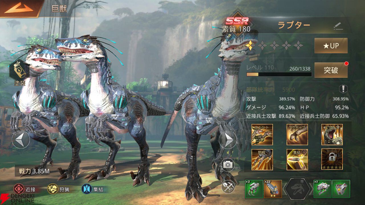 ティラノであれば突撃力が高く、ラプターなど複数の個体で行動する巨獣はそれぞれ別の目標を攻撃できるなど、巨獣の個性に合わせたスキル構成になっているので、戦略を練るのが楽しいですね。