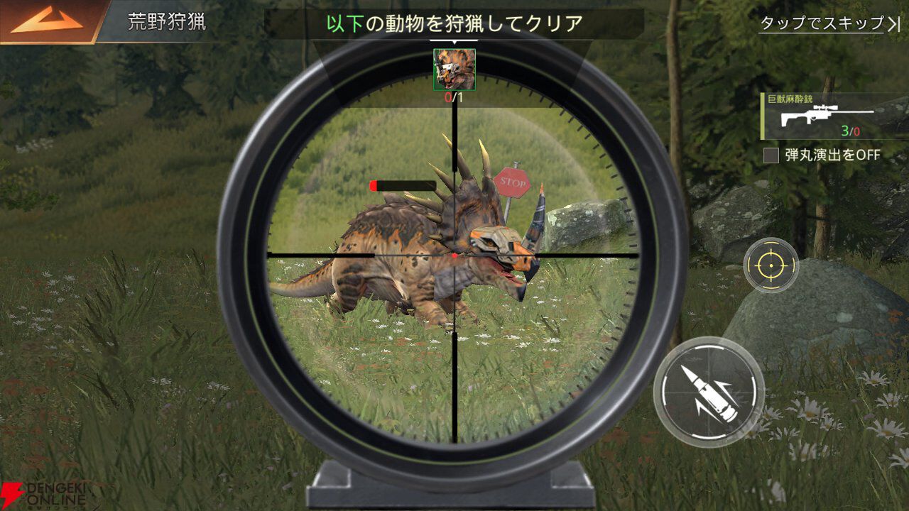 広大なワールドマップを探索し、そこで見つけた巨獣を捕獲することで持ち帰ることができます。しかも捕獲する方法が……なんとスナイパーライフルでの狙撃! タッチ操作で狙いを定めてから巨獣を撃ち抜きます。
