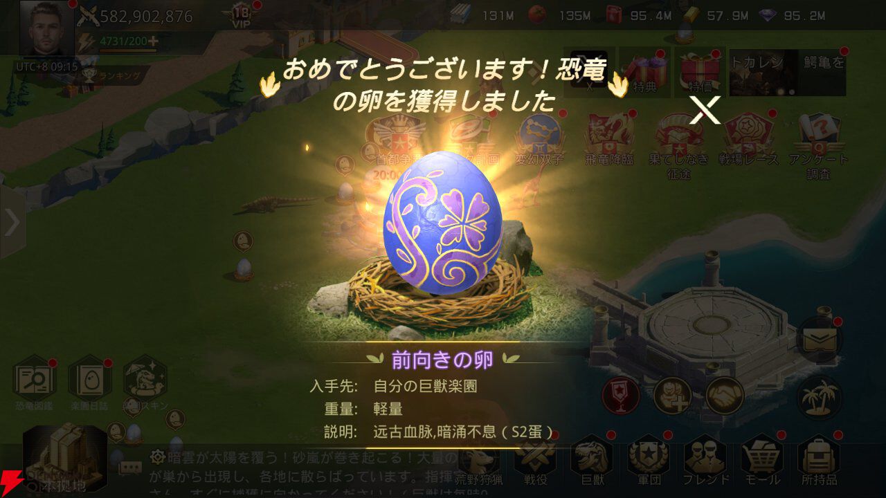 本拠地からは、“巨獣楽園”へと移動できます。こちらはいわゆる“ロビー”的な要素も含むもので、カスタマイズも可能。“巨獣の卵”も獲得できるので、戦力の増強にも利用できます。