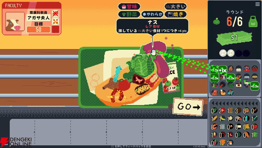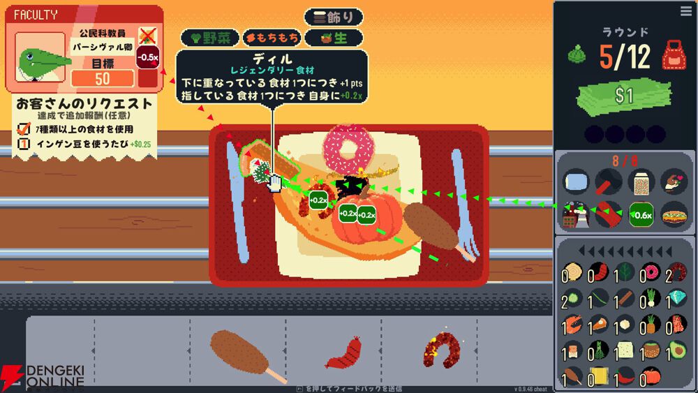 カオスな食材を置いていくというだけでもなんだか楽しいのですが、さらに特定の食材を組み合わせることで、スコア倍率を上げたり、同じカテゴリを揃えてコンボを発動させたりと、食材同士のシナジーを発見していくのがおもしろさの秘密。