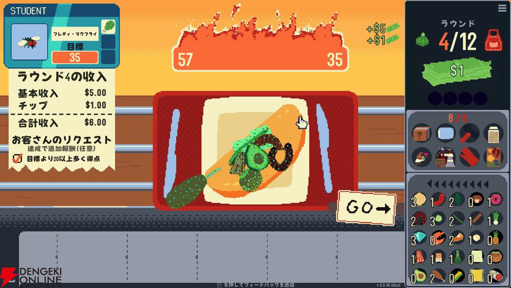 食材を自分の手でオムレツに配置しよう。食材同士は相互に影響し合い、唐辛子はすべてを燃やし、チーズは倍率を重ね、同じカテゴリを揃えることでコンボが発動する。