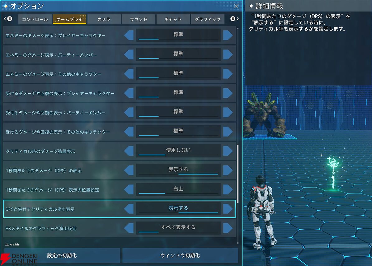 オプションメニューの“1秒間あたりのダメージ(DPS)の表示”がONの場合、“DPSと併せてクリティカル率も表示”が設定可能になります。