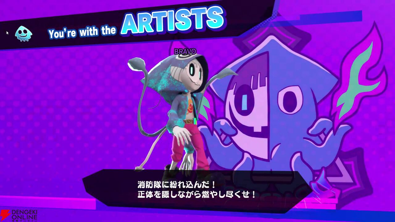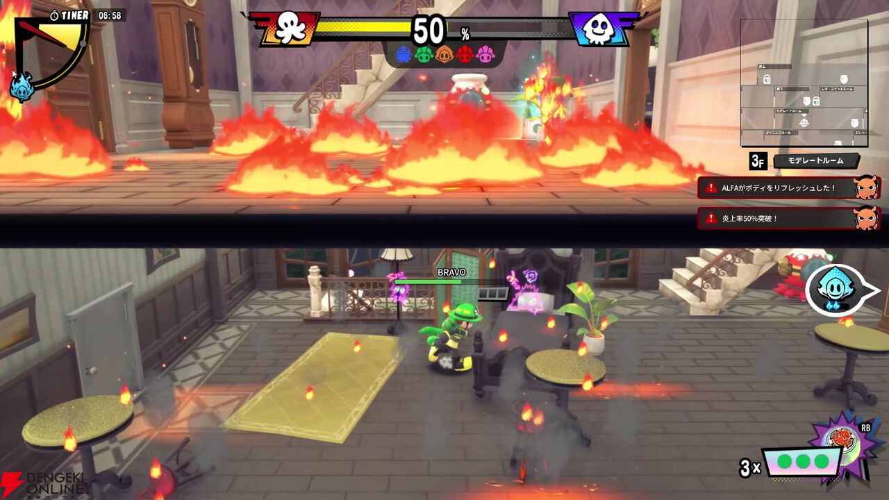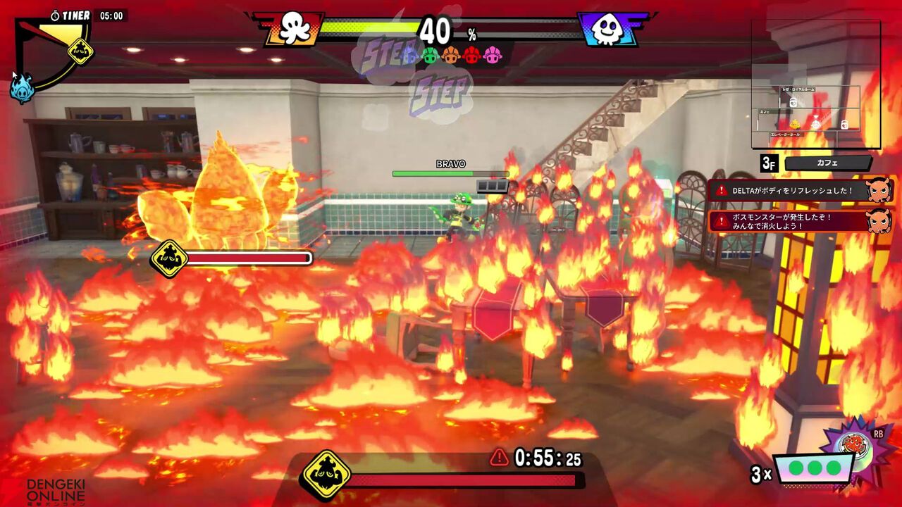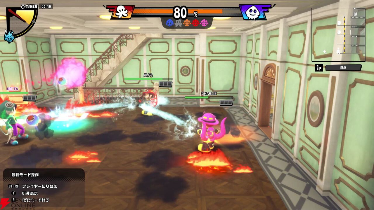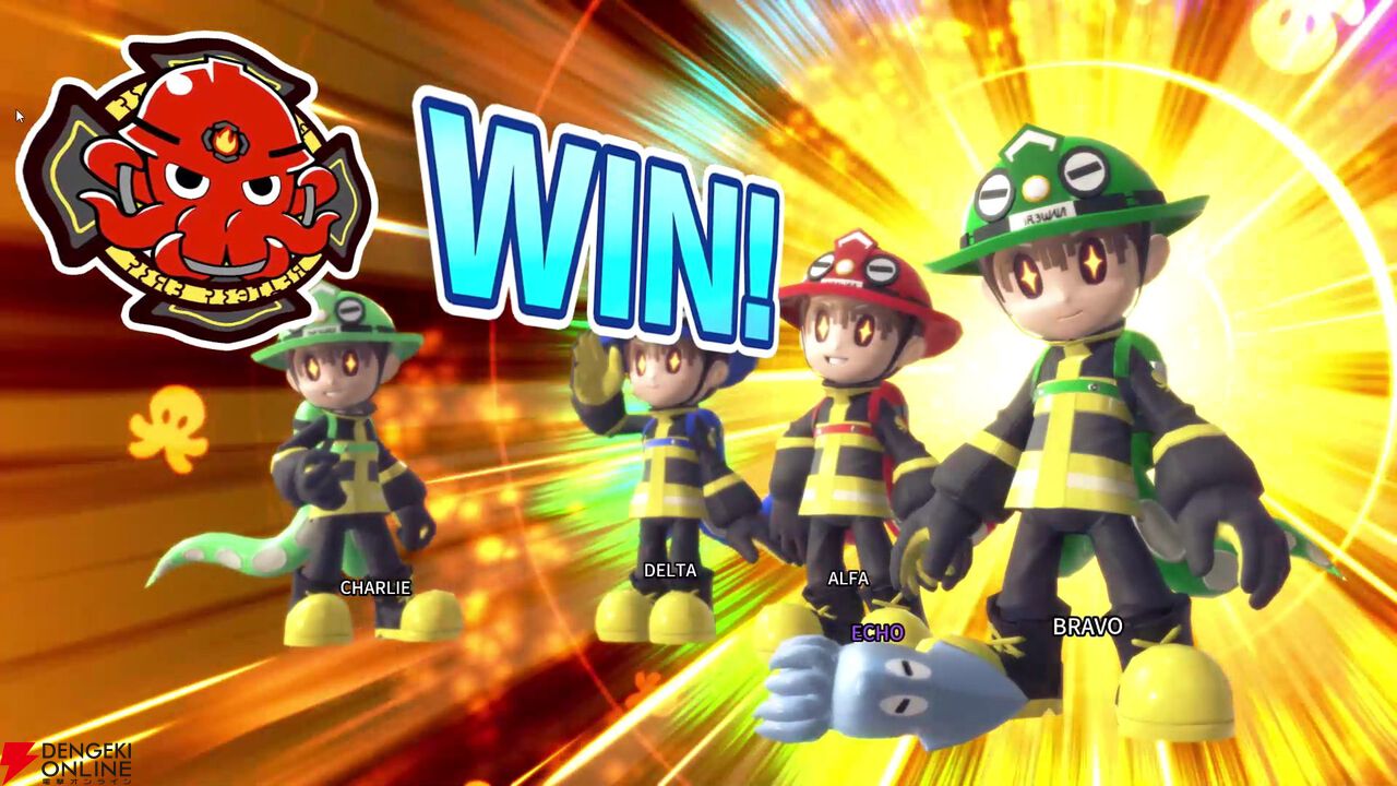 勝敗は、まず消防士(タコ)側は火災現場の火をすべて鎮火するか、紛れ込んでいるすべてのアーティストを見つけ出してタコツボで無力化すること。続いてアーティスト(イカ)側はビルの完全炎上か消防士を全員無力化すれば勝利となります。