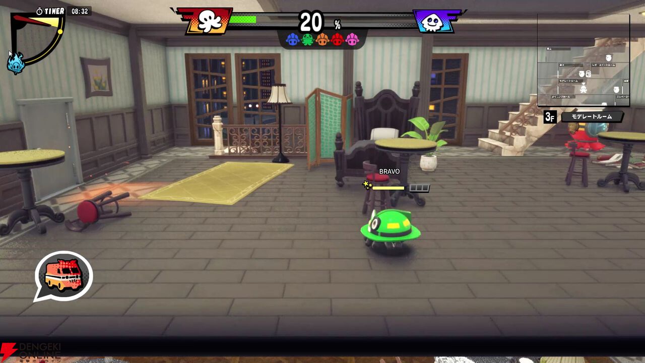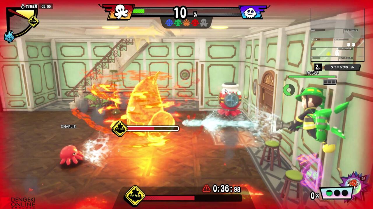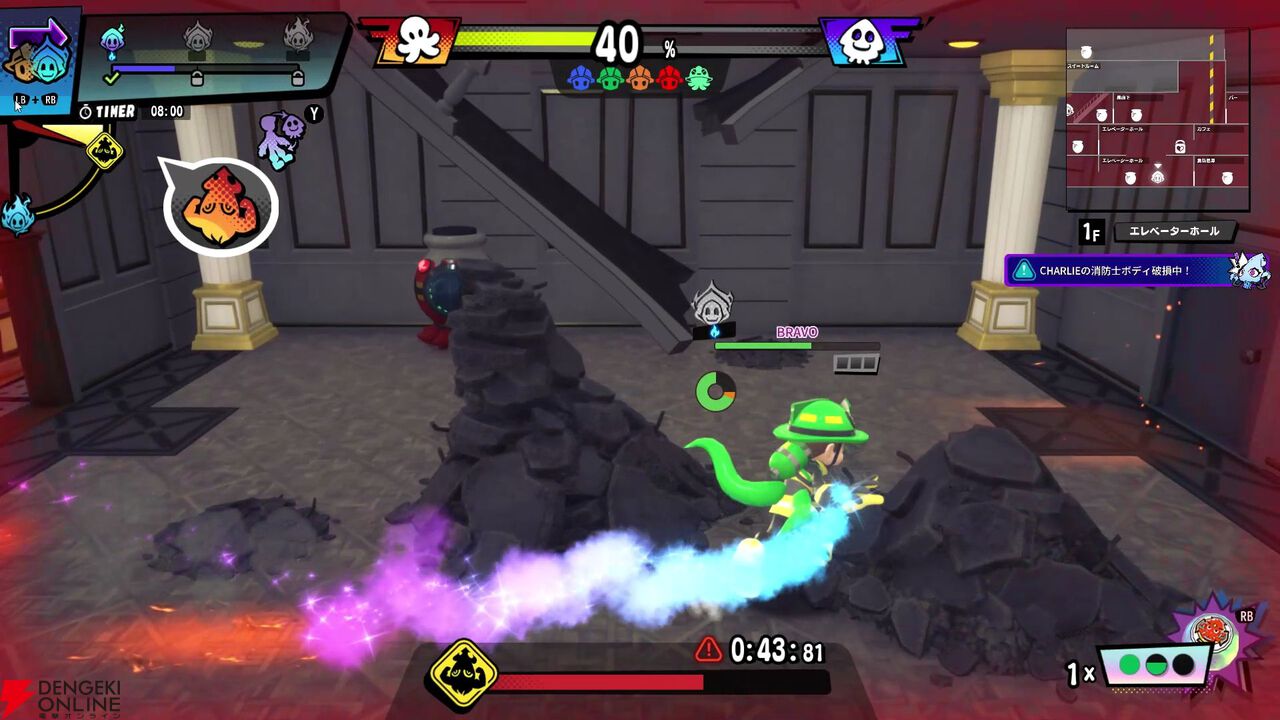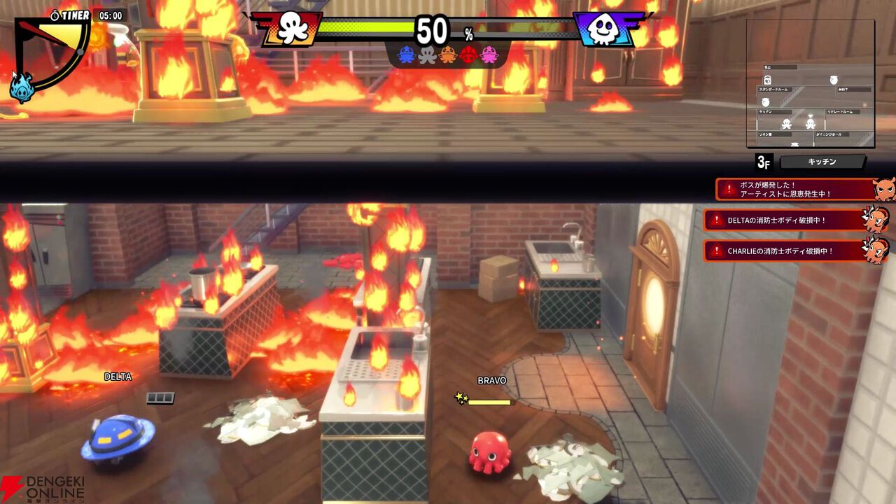 駆け引きやアクション性の部分はかなり奥深い! 消防士、アーティストともに共通してHPの概念があり、HPが0になるとボディ破損状態として人間形態から小さなヘルメット状態になってしまいます。この状態になると移動は可能ですが最低限の消火しかできなくなり、またタコツボに放り込まれ無力化されてしまう危険な状態。ただ、スタート地点の消防車に戻ることで元の姿にリフレッシュできます。