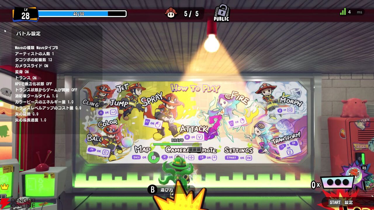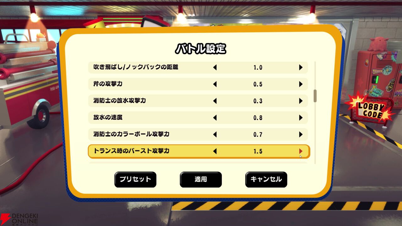 最大10人で遊べる本作ですが、部屋のルールをかなり細かく調整できるのもポイントでした。アーティストの人数をはじめ、タコツボの数。放水の攻撃力や速度、延焼の速度や炎の成長速度など、かなりの項目数が用意されています。