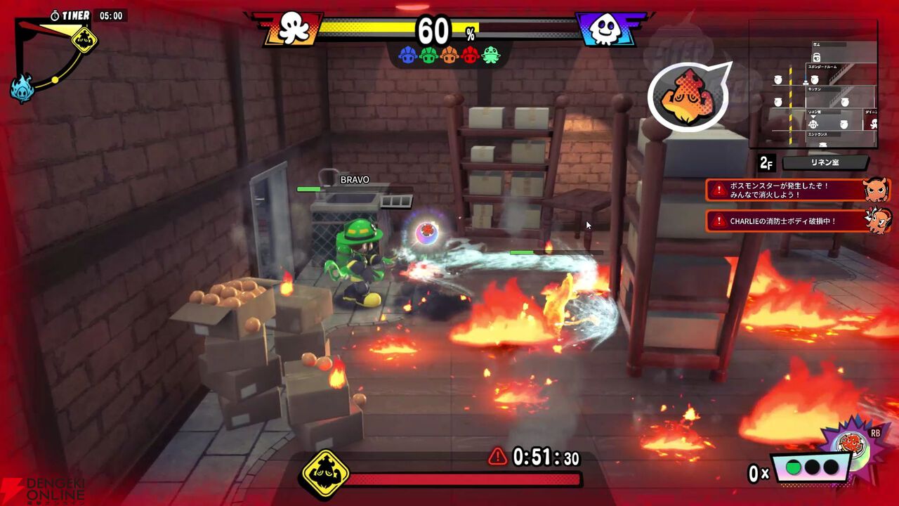 HPは火に触れる、消防士(敵味方問わず)からの放水を受ける、モンスターから攻撃を受けるなどで低下し、建物内にあるアイテムで体力回復が可能。とくに放水による微ダメージが正体を見破るうえで重要だと感じました。たとえば消防士同士が狭い部屋で火を消していると消火効率は良いのですが、どうしても放水が当たってしまいがち。そうなると「お? 狙っているのか?」と疑心暗鬼になったりして、味方同士のハズなのに疑ってしまう場面が何度もありました。