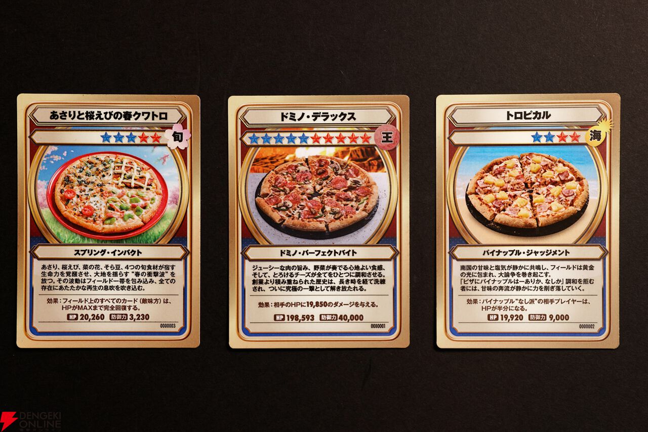 ドミノ・デラックス:1985年にドミノ・ピザが日本で創業した時から存在している看板商品。HP、防御力、そして、相手へ与えるダメージが『ドミノ・カード』の中で一番高い数値を誇る。