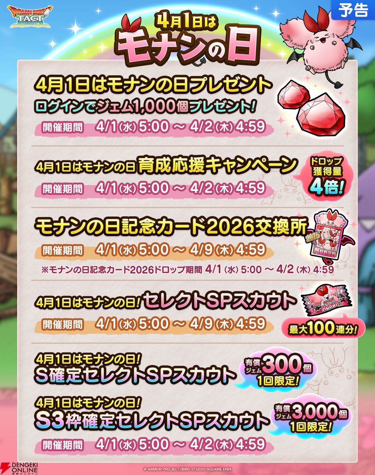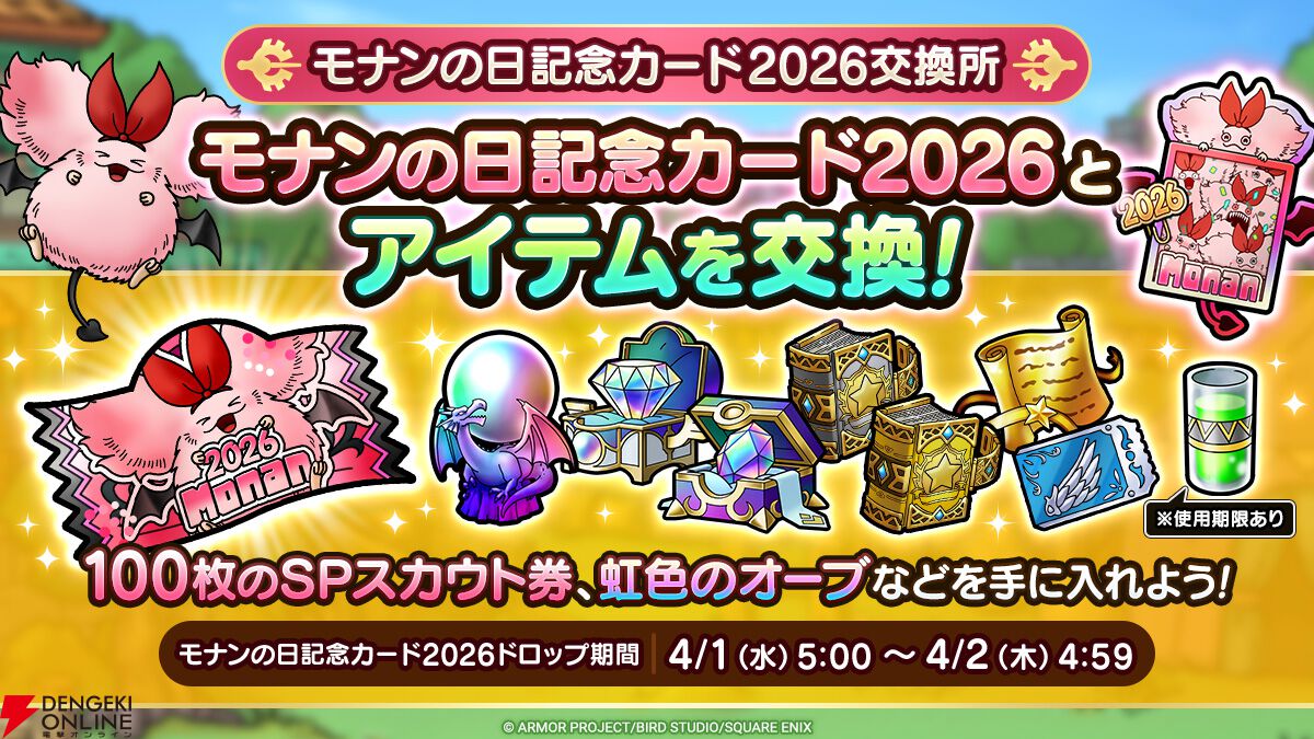 スクウェア・エニックスのiOS/Android用アプリ『ドラゴンクエストタクト』で、4月1日の“モナンの日”にあわせてログインボーナスの配布や特別なSPスカウトの開催などを実施します。