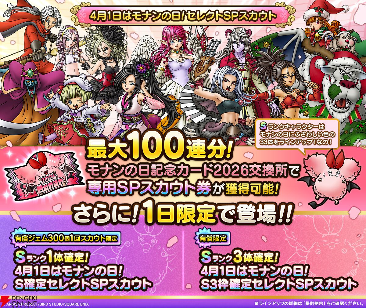 1日限定で、“モナンの日記念カード2026交換所”で獲得できる“4月1日はモナンの日!2026セレクトSPスカウト券”で専用のSPスカウトを無料で利用できます。Sランクは、英雄系“まもの使い(女)”、“夏宵の祭華デボラ”など33体がラインアップ!