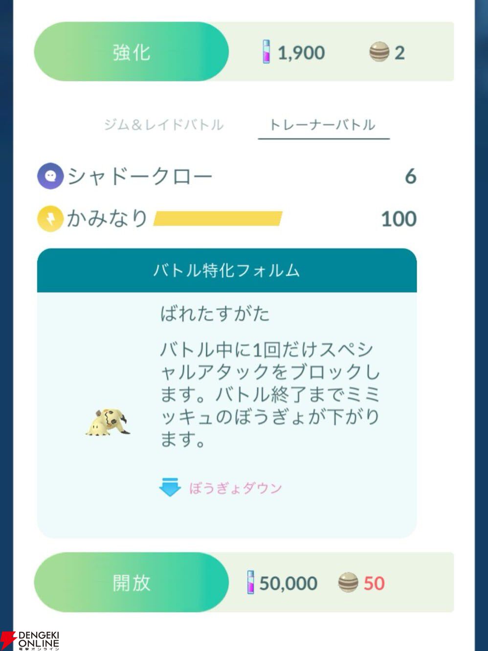 特性“ばけのかわ”が再現されており、バトル中に1回だけスペシャルアタックをブロック可能。その後バトル終了までぼうぎょが下がります。