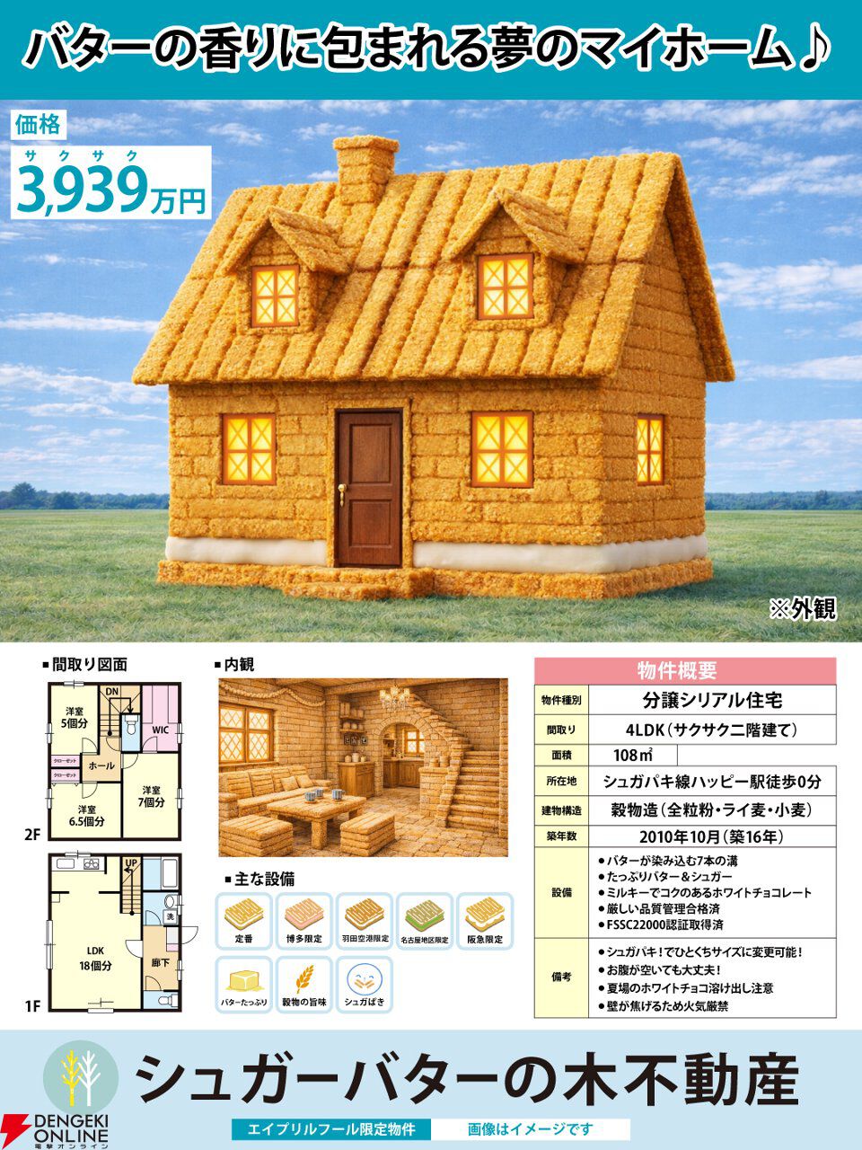 シュガパキ線ハッピー駅徒歩0分の超駅チカ物件。108㎡・二階建て・3939万円の分譲シリアル住宅となっています。素材には各地域の限定味の『シュガーバターの木』も使われているようなので、ファンにはたまらないはず!?
