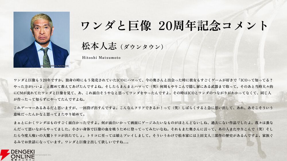ダウンタウンの松本人志さんより『ワンダと巨像』20周年のお祝いメッセージをいただきました
