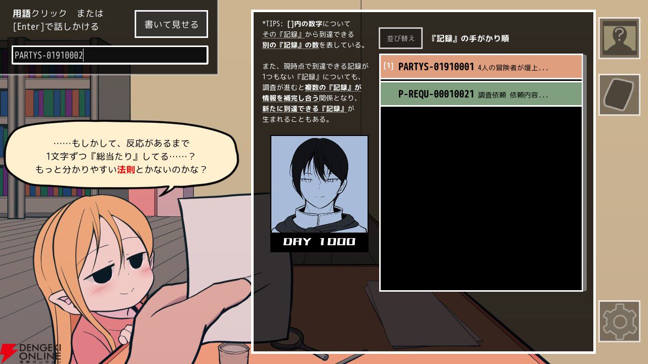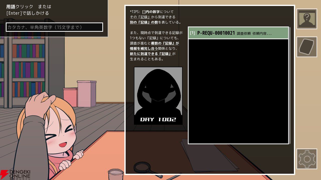 主人公の助手を務めるのは、まだ小さい女の子の助手ちゃんです。助手ちゃんは文字を読むことはできませんが、文字を“形”として記憶しているため、正しいシリアルナンバーを見せて「この資料ある?」と問いかけるとそれに応えてくれます。