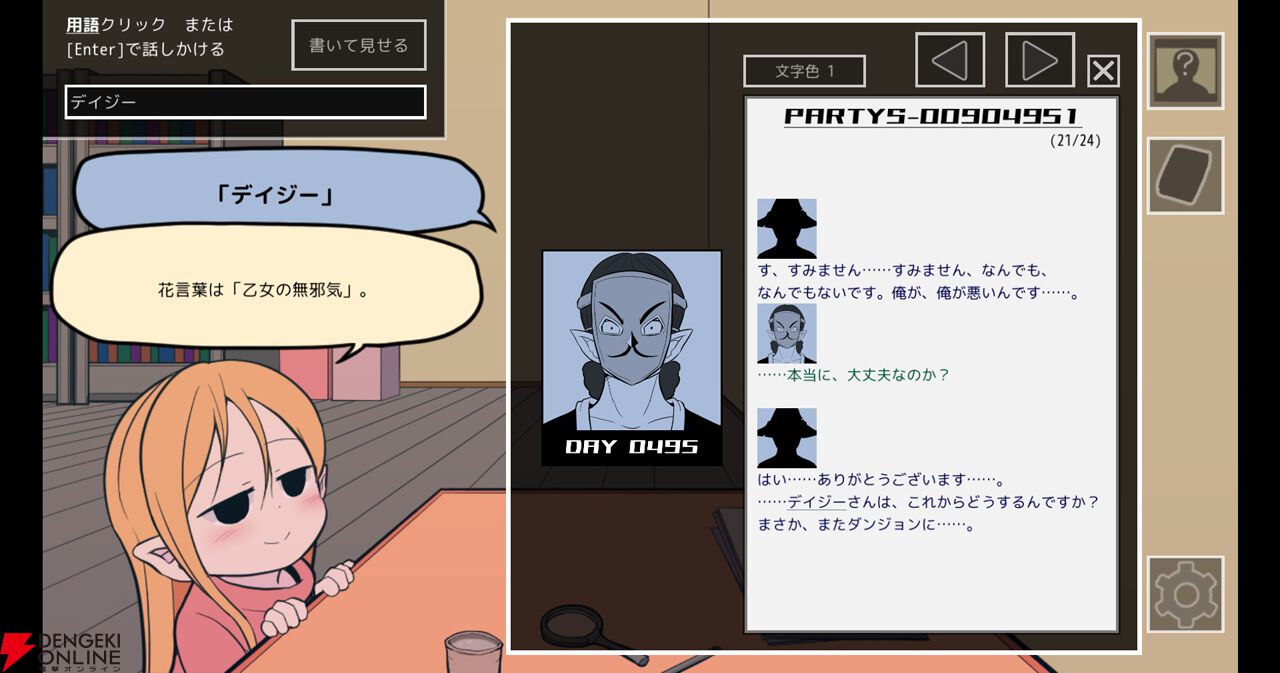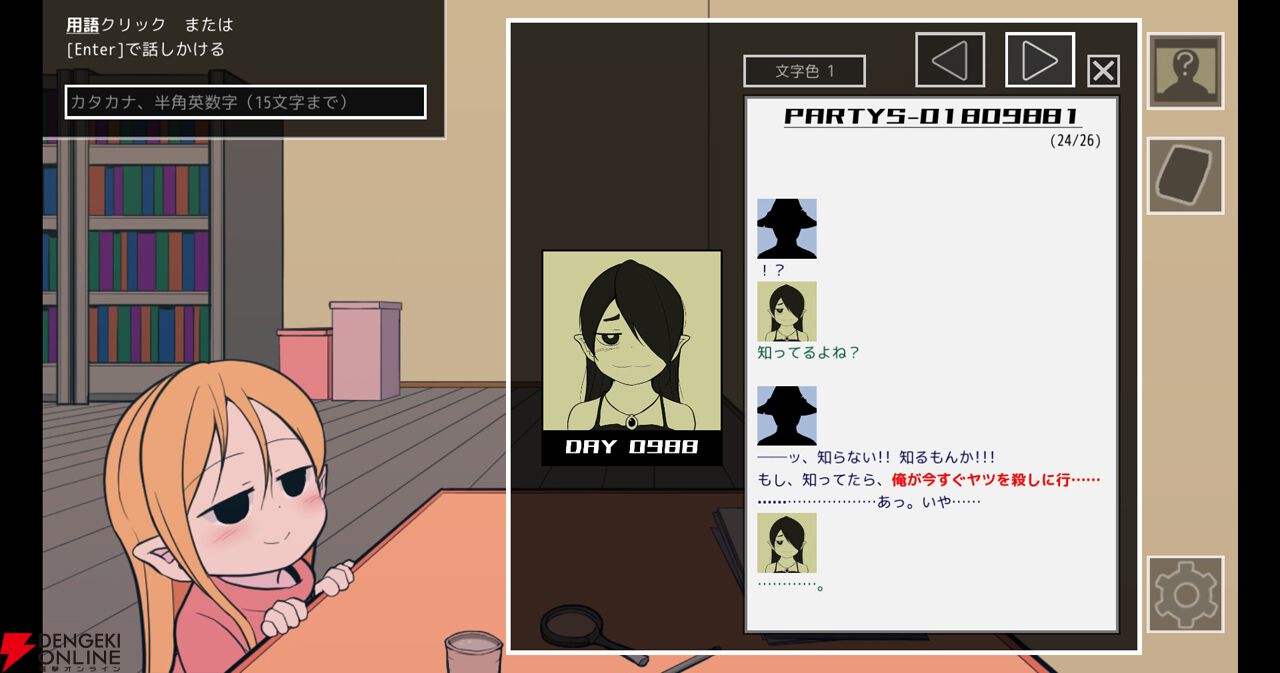 資料と言っても主人公が保持しているのはニュース、ゴシップ、インタビューなど、パーティの断片的な情報が記された記事の数々のみです。膨大な蔵書の中から資料を集めるのも一苦労なうえ、それぞれを読み込んで点と点を繋いでいく作業も一筋縄ではいきません。