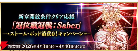 FGO PROJECTは、スマートフォン向けFateRPG『Fate/Grand Order』にて、4月3日(金)から期間限定『新章開放条件クリア応援“冠位戴冠戦:Saber”ストーム・ポッド消費0!キャンペーン』を開催します。あわせて、“黄金の果実”を最大7個獲得できるログインボーナスも実施します。