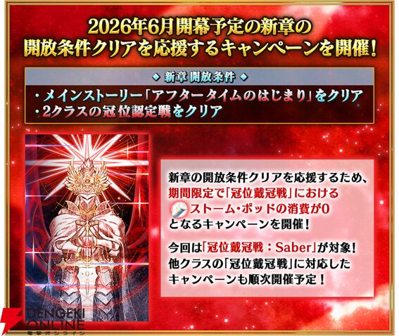 『新章開放条件クリア応援“冠位戴冠戦:Saber”ストーム・ポッド消費0!キャンペーン』の開催を記念した特別回数ログインボーナスを実施いたします。