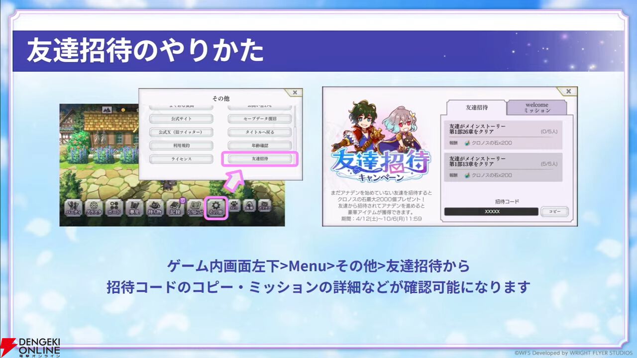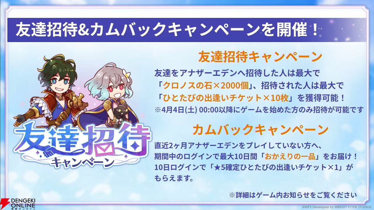 友達招待&カムバックキャンペーンも開催されます。招待した人はクロノスの石が最大2000個、招待された人はひとたびの出逢いチケットが最大10枚手に入ります。